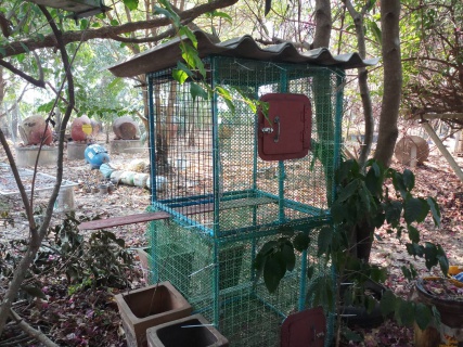 กรงนี้ทำจากท่อพีวีซีและนำไปจากบ้านปากน้ำที่ไม่ได้เลี้ยงแล้วต้องนำไปประกอบใส่ตะแกรงเพิ่มและต้องเสริมด้วยตาข่ายถี่หน่อยป้องกันสัตว์ฟันแทะ