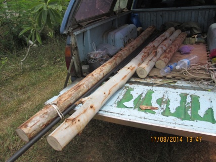 ไปซื้อไม้เสามา2ต้นต้องไปเลือกแบบตรงแป๊ะเลยนะเพราะไม่ตรงเดี๋ยวทำลำบากเพราะทำคนเดียวถ้าคด งอ จะต้องมีคนช่วยหลายคนซื้อมาพร้อมท่อแป๊บ 1 นิ้วเอามาทำกำแพงด้านหน้าซุ้ม