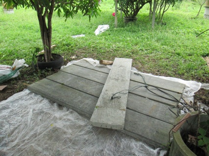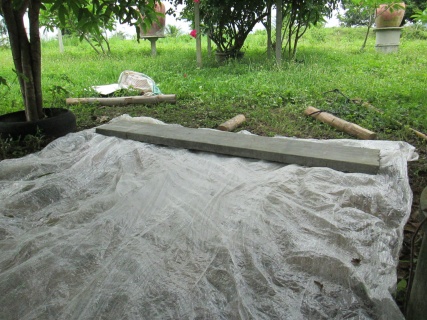 หลังจากปรับพื้นก็ปูพลาสติกกันหญ้าขึ้นมาตามร่อง แล้วก็ขนแผ่นปูนมาวางเรียง