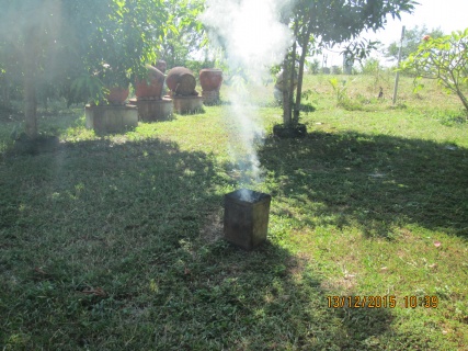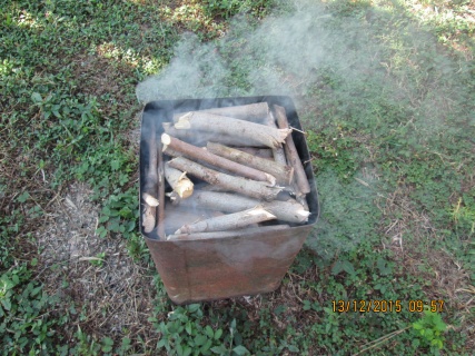 เริ่มเผาถ่านตามแบบฉบับนายปัทม เผาในปี๊บจากที่เลื่อยไม้ไว้ได้เวลาเผาสักที ถ่านก็เริ่มร่อยหลอ