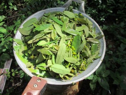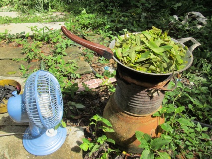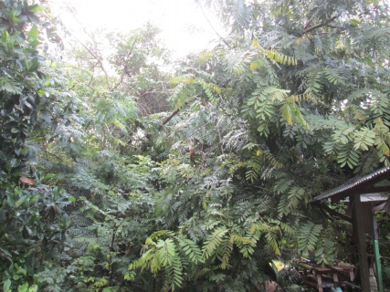 มาถึงสวนเจอเหตุการณ์ไม่คาดฝันงานเข้าเลยครับกิ่งขี้เหล็กล้มลงมาใสที่หลังคาต้องตัดซิครับเสียดายยอดอ่อนและดอกเลยจัดการรูดมาต้มกลับบ้านไปแกงซะ เกษตรกรบ้านนอกอะนะ