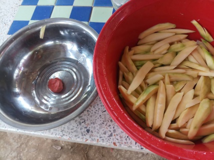 ละลายน้ำปูนใสรอมะม่วงแช่หน่อยตั้งใจจะเชื่อมเลยต้องให้เเข็งหน่อย