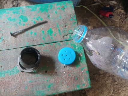 คว่ำไว้ก่อนพอดีมีตะแกรงเลยเอาเสียบไว้แบบนี้ให้สะเด็ดน้ำเอาเก็บใส่กระสอบไว้ ก่อนตอนนี้ไอเดียร์ยังไม่ออก