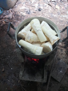 ต้มหน่อไม้ด้วยถ่านจากไม้ไผ่เราเองสมดุลย์มวลและพลังงานครับในพื้นที่เราเอง