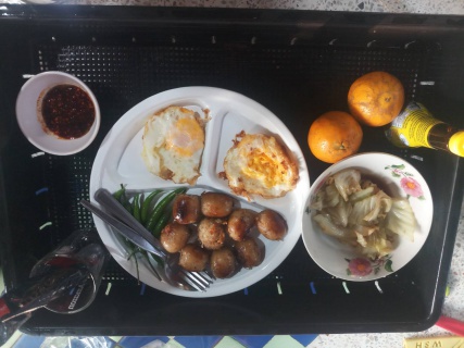 เราก็มี อาหารบ้านๆให้สำหรับเพื่อนที่ก็ไส้กรอกและไข่ดาว กับกระหล่ำปลีผัดน้ำปลา