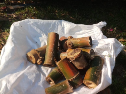 เผาถ่านไม้ไผ่ที่เตียมไว้ร่วมกับถ่านกะลา ให้เผาไปพร้อมกัน
