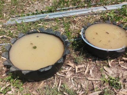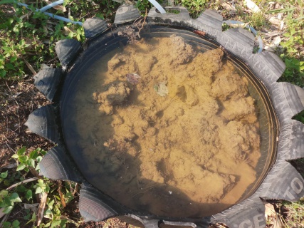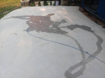 ปูนที่เทด้วยรถปูนมันออกสีขาวมากกว่าปูนที่ผสมเองนะ คราวนี้พอมันแห้งแล้วขาวโพลนเลยเราต้องเอาน้ำฉีดบ่มมัน สักหน่อย แต่หลายงานในเวลาจำกัดต้องทำอาทิตย์นี้ก็ได้ขนวงล้อยางที่ทำเป็นอ่างบัวไป ทีเเรกว่าจะปลูกแหนแดง เอาบัวก่อนละกัน