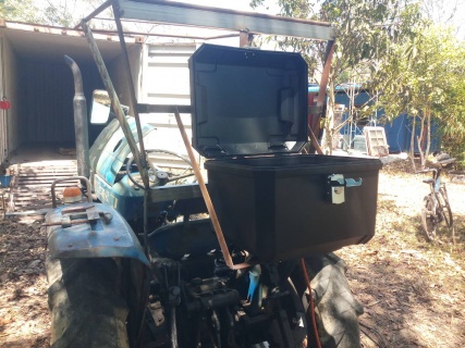 เมื่องานไถไม่ได้จำกัดแค่เรื่องที่ไถดินแต่รวมไปถึงการยึดสกรู การถอดอะไหลหลายอย่างรถไถต้องมีกล่องใส่เครื่องมือละ ไอเดียร์บรรเจิดเลยไปเห็นกล้องท้ายมอเตอร์ไซด์เหมาะมาก ก็จัดไป1 กล่องเอามาติดตั้ง ต้องทำที่วางรับกล่องให้สวยงามเหมาะกับการใช้งาน