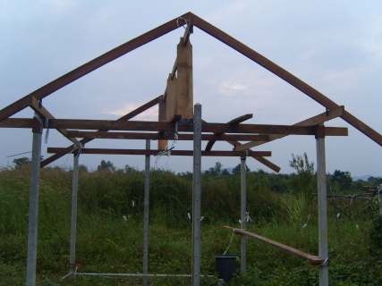 มองระยะไกลครับขึ้นจั่วแล้ว ไม่นานก็ได้มุงหลังคาแล้ว ทำคนเดียวเมื่อยน่าดูครับ