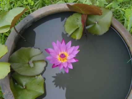บัวทุกอ่าง ออกดอกครบทุกอ่างเลย ตั้งไว้ตรงที่น้ำไหลลงมาจากหลังคาพอดี เป็นดัชนีชี้วัดว่ามีฝนมากน้อย แค่ไหน