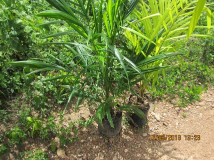 ทดลองปลูกระหว่างปาล์มที่เราเพาะเมล็ดเองกับ ซื้อเขามาปลูก สองต้นนี้คนขายบอกว่าเป็นพันธ์ ไนจีเรียแบล็ค อยากรู้จริงๆๆว่าเราเก็บเมล็ดมาเพาะมันจะไม่ติดลูกเลยเหรอ 5 ปีค่อยมาดูกัน นำไปปลูกทดลองที่สวนใหม่