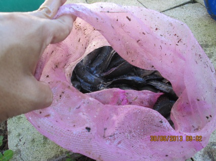 ใส่ถุงตาข่ายกรองน้ำออกเอาไปไปล่อยที่สระน้ำ สวนพชรด้านหลัง