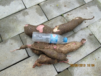 ขุดมันสำปะหลังกลับบ้านนำขวดน้ำมาเที่ยบให้ดูว่าขนาดใหญ่กว่าขวดน้ำ