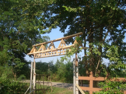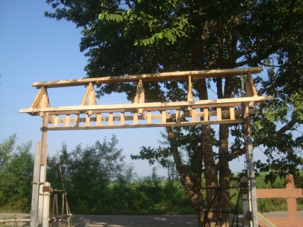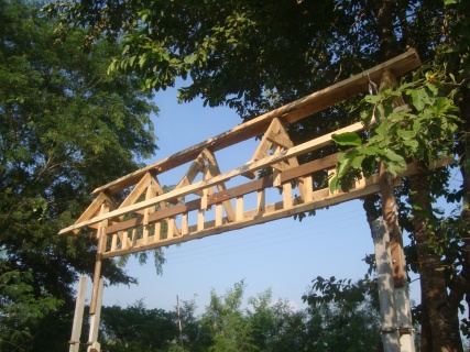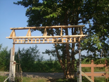 มีไม้สั้นก็ต้องใช้หัวกันมากหน่อยเอามาต่อ ทำลายแปรรอยกขึ้นทำแปร เพื่อรอมุงหลังคาซุ้มป้าย
