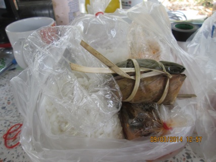อาหารเช้า ก็ไม่ต่างจากในเมื่อแกงถุงครับ ไม่มีเวลาทำเองเพราะถ้าทำกับข้าวหมดเวลาทำงานแน่ๆๆ ออกไปซื้อมาตอนเช้าบรรยากาศ ท่าตะคร้อก็คึกคักดี ข้าวต้มมัดบ้านคุณลุงปลัดให้มา มื่อเย็นท่านชวนไปทานข้าวที่บ้านท่าน ลาภ ปากไปมื้อหนึ่ง แถมขนมติดไม้ติดมือมาด้วย