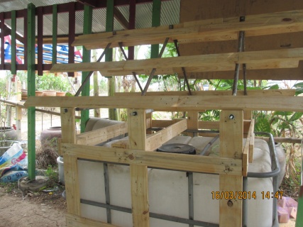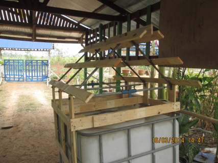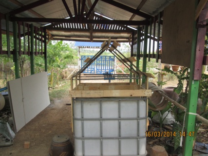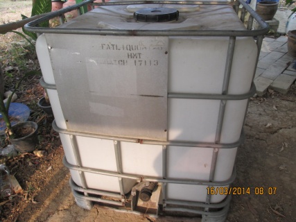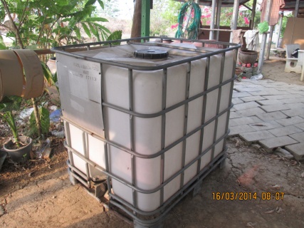แท็งค์น้ำขนาด 1 ลูกบาศก์ เมตร หรือ 1 คิว ก็เป็นถังจากพวกอุตสาหกรรมที่เราเห็นทั่วไปอาจจะใส่พวกสารเคมีบางอย่างมา แต่เนื้อพลาสติกเป็น พวก HDPE ก็ทนพอสมควรครับ นำมาใส่น้ำเพื่อสร้างระบบน้ำให้สวนพชร เมื่อถังมาถึงสิ่งที่ควรคำนึงถึงต่อคือเรื่อง ถังตากแดด ต้องใส่หลังคาให้ถังหน่อยจ้ามาดูกันนะว่าทำอย่างไรบ้าง (งานอื่นก็ยังคงไม่เสร็จเพราะมีงานด่วนมา 55 )