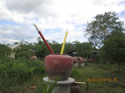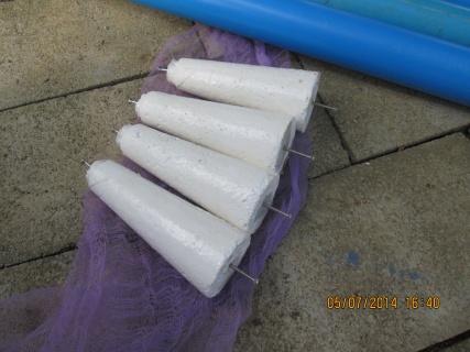 ตัวดินสอใช้ท่อ พี วี ซี ขนาด 2 นิ้วทำหล่อปูนที่ปลายให้ปูนเกาะกับเกลียวที่ขันไว้แล้วตังกัวดินสอรอให้ปูนแห้ง