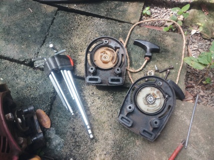 รื้อออกมาชัวร์เลยลานกระตุกเชือกกลับหลุดเรียบร้อยถ้าเรามานั่งกวดลานเข้าไปใหม่ วันนี้ก็ไม่เสร็จ พอดีมีตัว ที่เป็น 4 จังหวะอยู่1 ตัวได้ถอดมาใส่ก่อนให้แกได้ใช้งานก่อน
